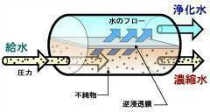 浸透膜という数ミクロンの膜に圧力をかけて水分子だけ通すアメリカで生まれた逆浸透膜浄水装置。海水や汚水を限りなく真水に変えます。鉄・銅・溶解性鉛・水銀・トリハロメタン・カドミウム等のイオン化合物を95%以上除去し安全な水に変えます。この装置は圧力ポンプが必要で、日本国内では水圧が低いところが多く、市販品でポンプがないものは除去率が低下します。また排圧の調整をし圧力調整をする為、専任の技術者、メンテナンスが必要とされるので工事、修理等は専任業者にご相談ください。弊社の提案する装置はTDS平均値3以下の超軟水ですので安心してご利用いただけます。